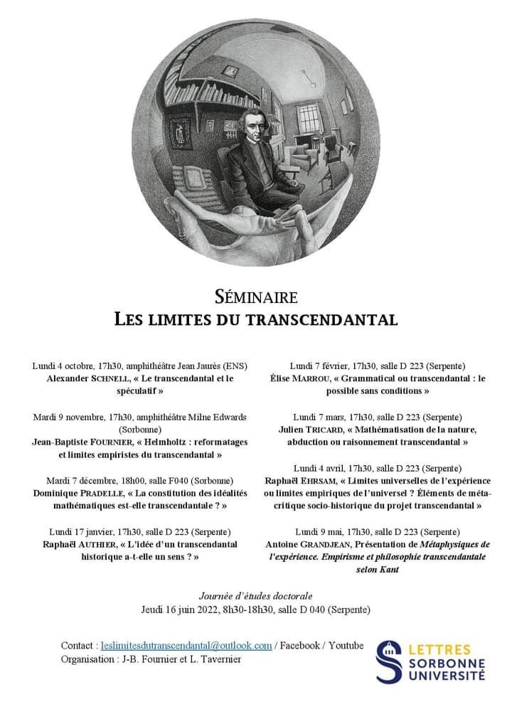 Le séminaire « Les limites du transcendantal » est un séminaire mensuel que j’ai co-organisé de 2021 à 2023 avec Laura Tavernier puis depuis septembre 2023 avec Luz Ascarate et Quentin Gailhac, dans le cadre de l’UR 3552 : « Métaphysique : histoire, transformations, actualité » de la Faculté des lettres de Sorbonne Université.